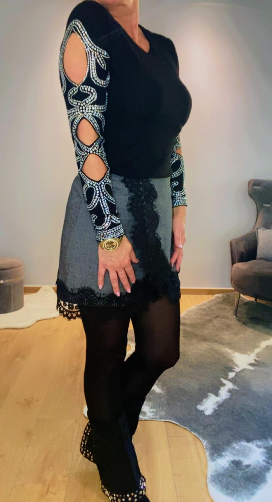Schwarzes Shirt mit Glitzersteinen an den Ärmeln – Cuts