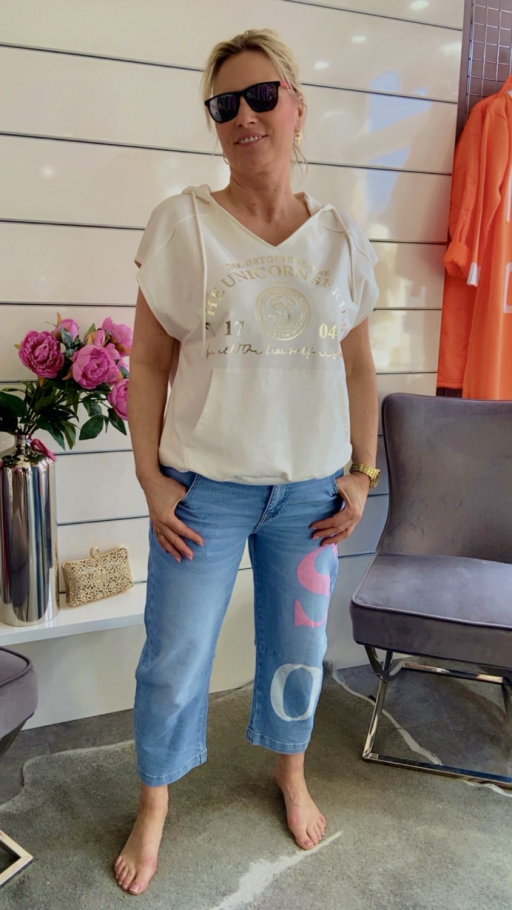 Stylische Details durch Frontprint , kurze Ärmel und praktische Kängurutasche, ein echter Hingucker