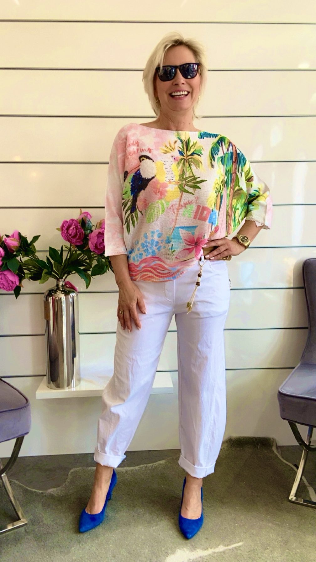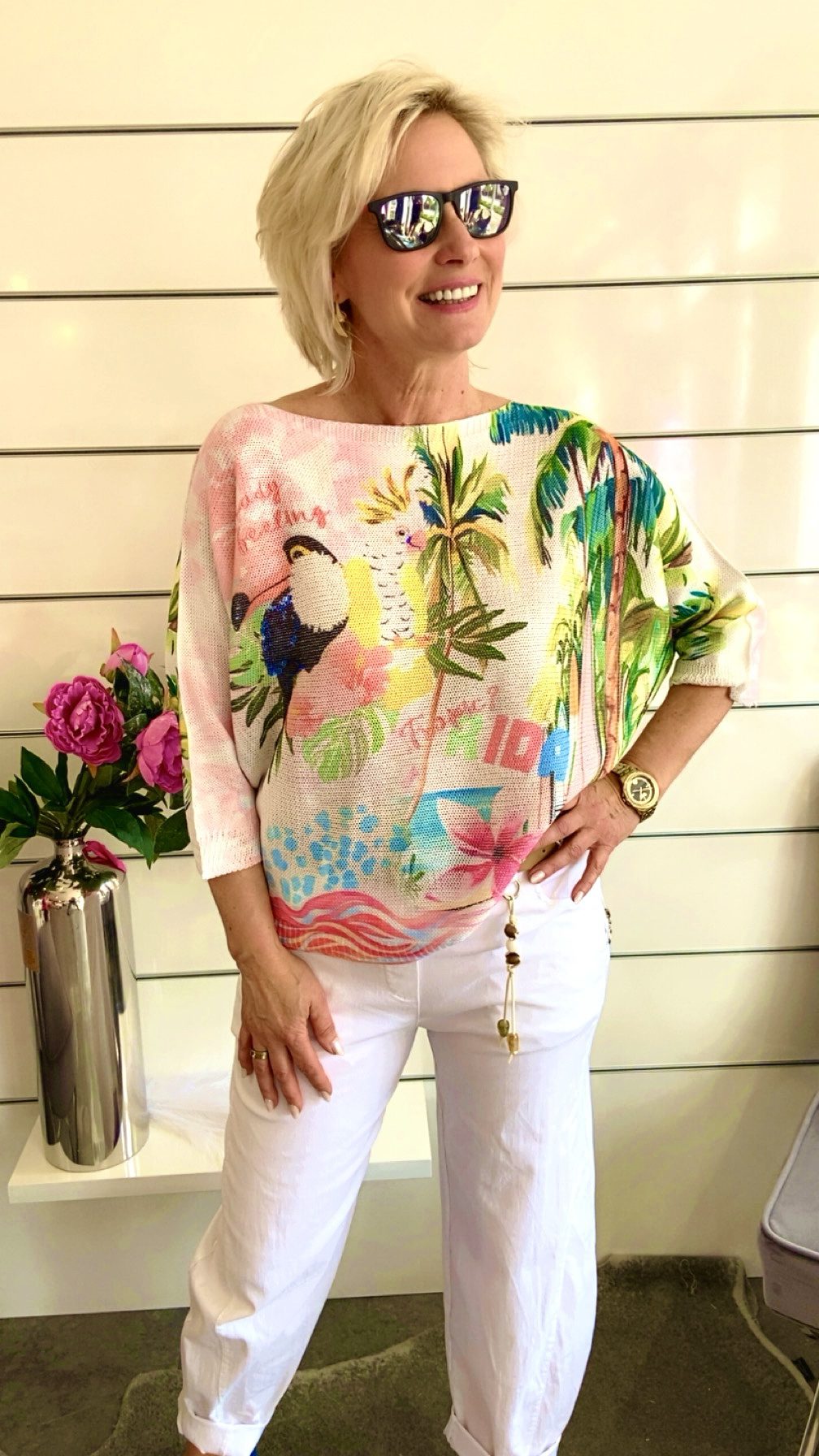 Tropischer Print mit Frau, Meer oder Vogel, bringt sofort Urlaubsfeeling in deinen Look